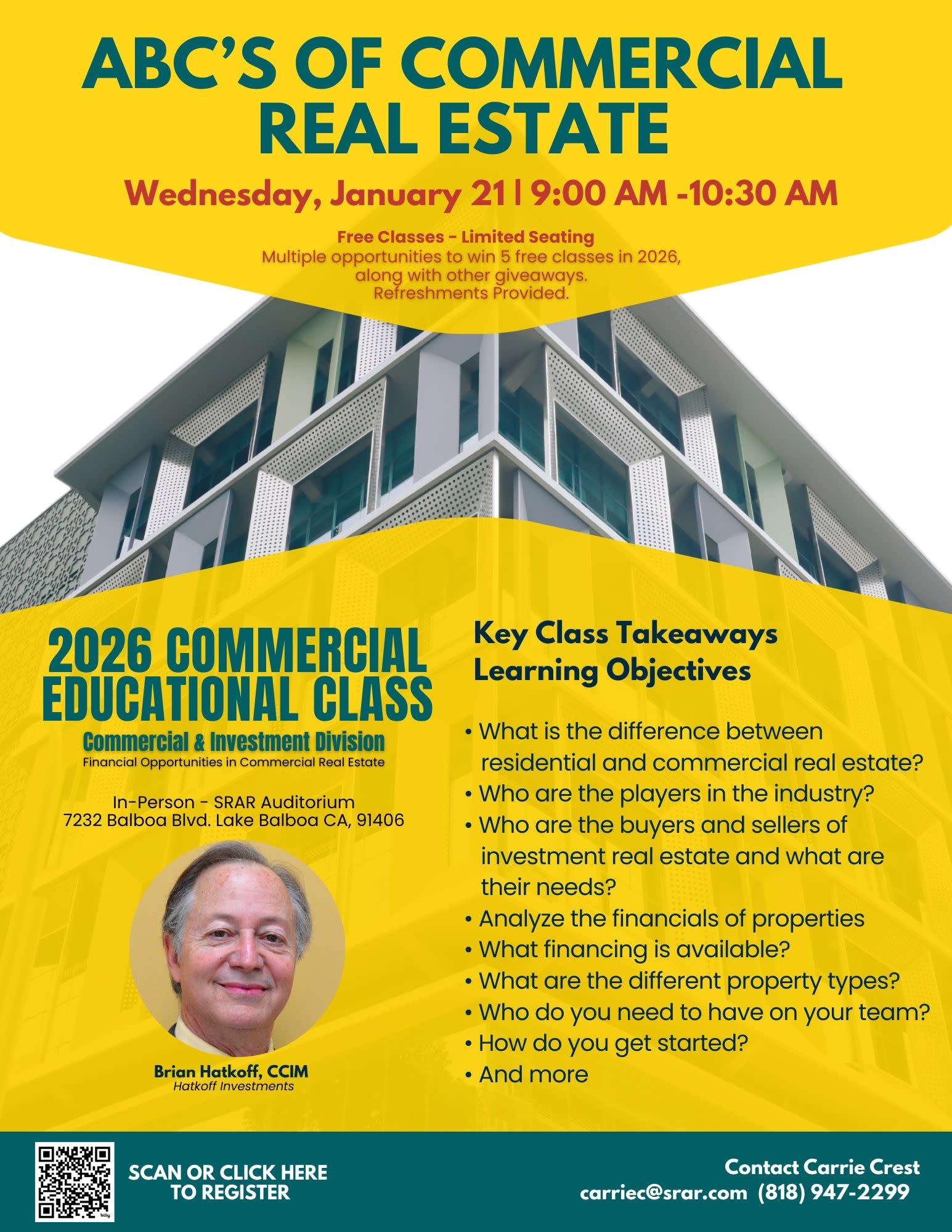 Brian Hatkoff, CCIM with Hatkoff Investments, will be covering the basics of commercial real estate. This class is designed to give you practical insights you can use right away! Whether you're looking to expand your expertise, explore new opportunities, or stay competitive in a fast-changing market, you won't want to miss this session.