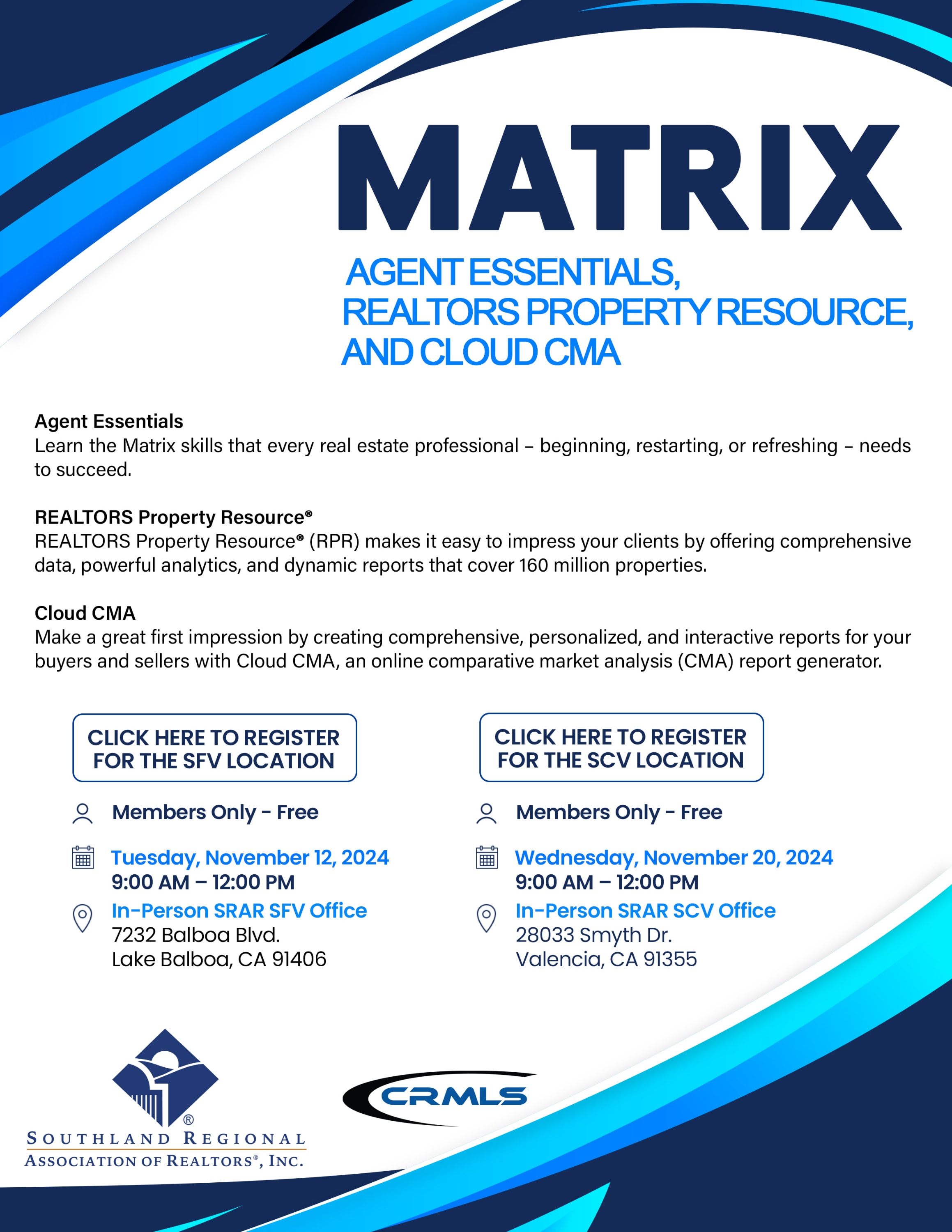 Agent Essentials Learn the Matrix skills that every real estate professional – beginning, restarting, or refreshing – needs to succeed. Topics include: • Search techniques • Printing and emailing listings • Setting up client information in CRMLS Matrix • …and more. Realtors Property Resource REALTORS Property Resource® (RPR) makes it easy to impress your clients by offering comprehensive data, powerful analytics, and dynamic reports that cover 160 million properties. Topics include: • School reports • Historic data • Geographic details (such as flood and heat maps) • …and more Cloud CMA Make a great first impression by creating comprehensive, personalized, and interactive reports for your buyers and sellers with Cloud CMA, an online comparative market analysis (CMA) report generator. Featuring built-in integration with Zoom, Skype, and Google Meet, you can give presentations to anyone, anywhere, anytime. This course will teach you how to create: • CMAs • Buyer tours • Single property reports • Property flyers • …and more.Additional Info