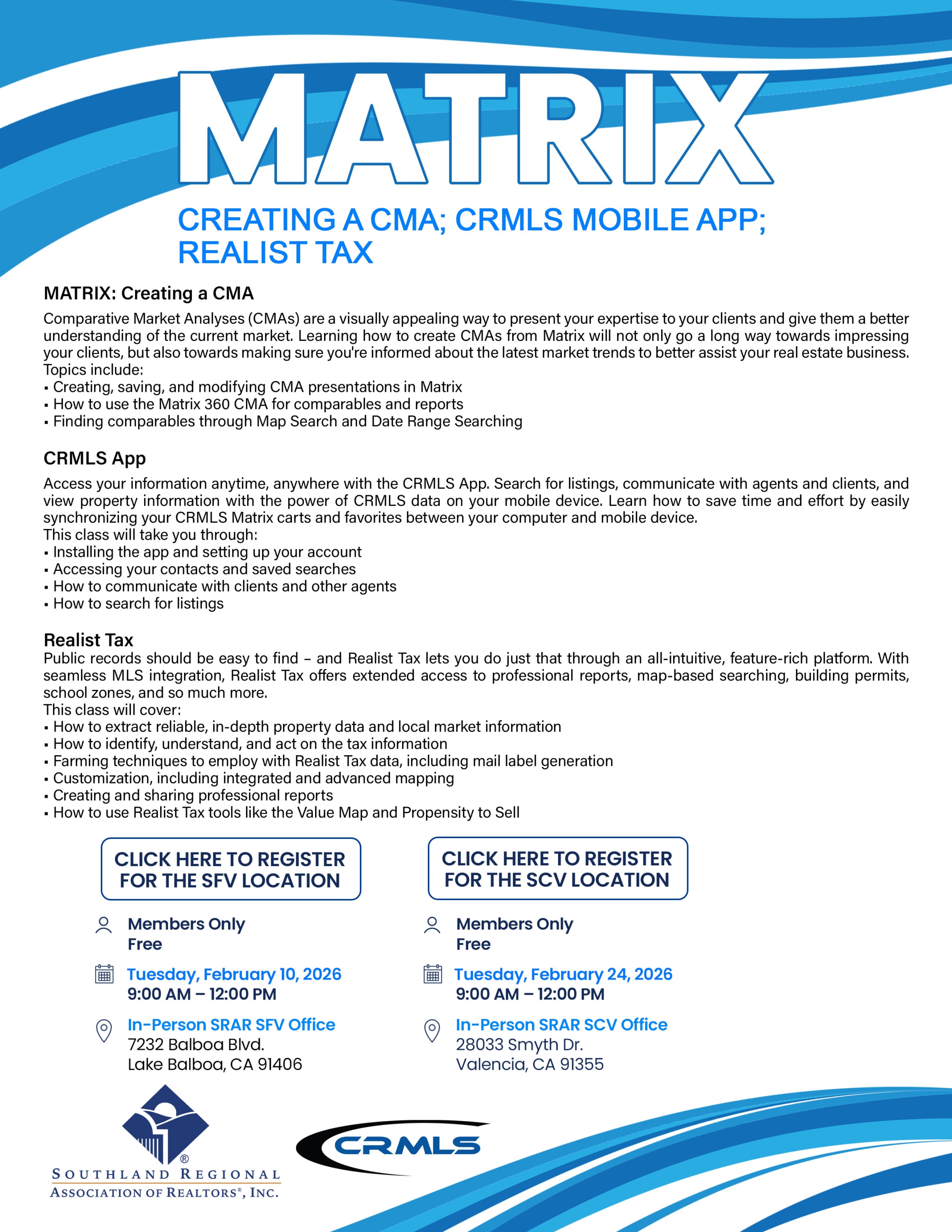 CRMLS Matrix: Creating a CMA; CRMLS Mobile App; REALIST Tax
