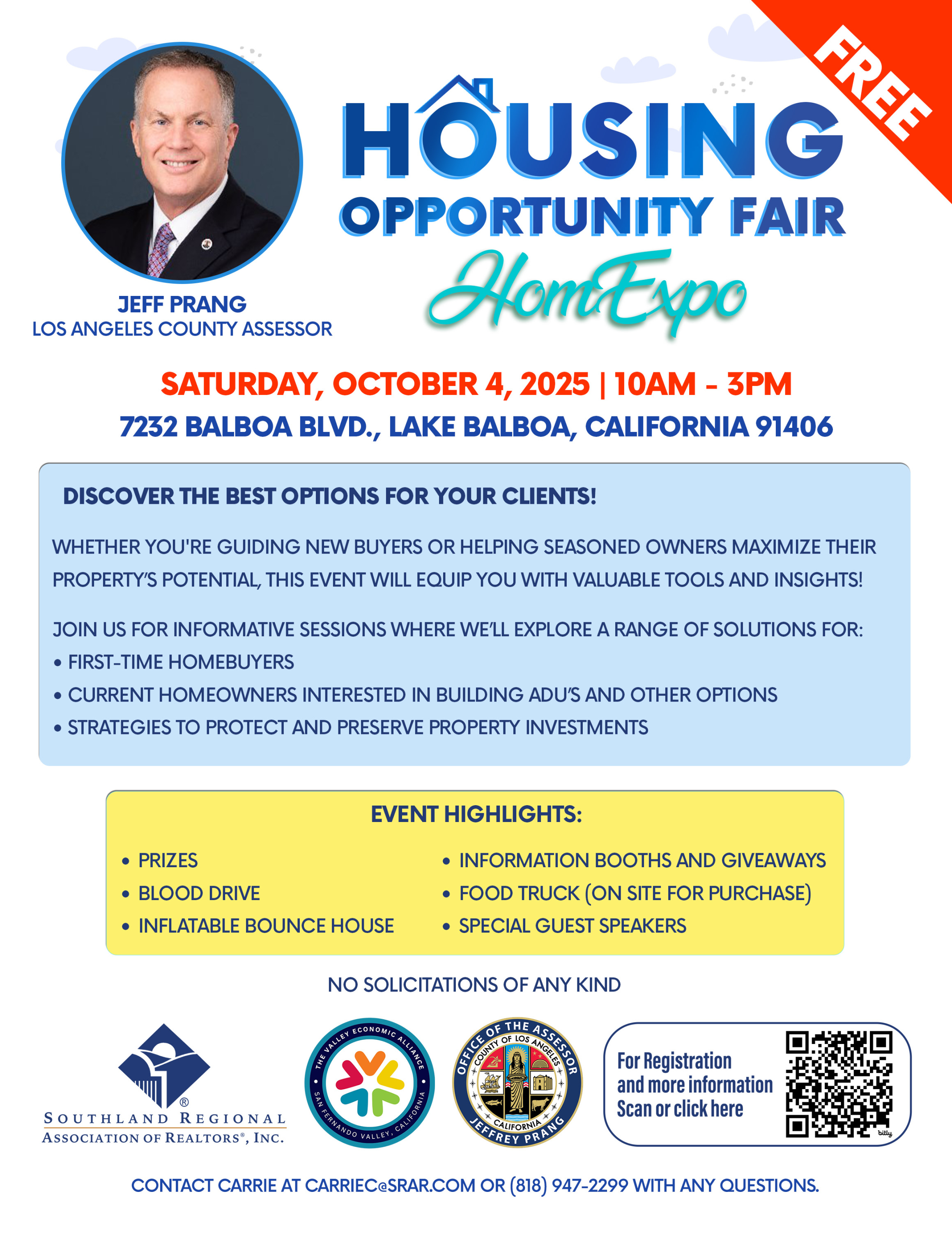 Southland Regional Association of REALTORS® has partnered with the L.A. County Assessor to bring you the Housing Opportunity Fair | HomExpo. A FREE resource fair you will not want to miss!