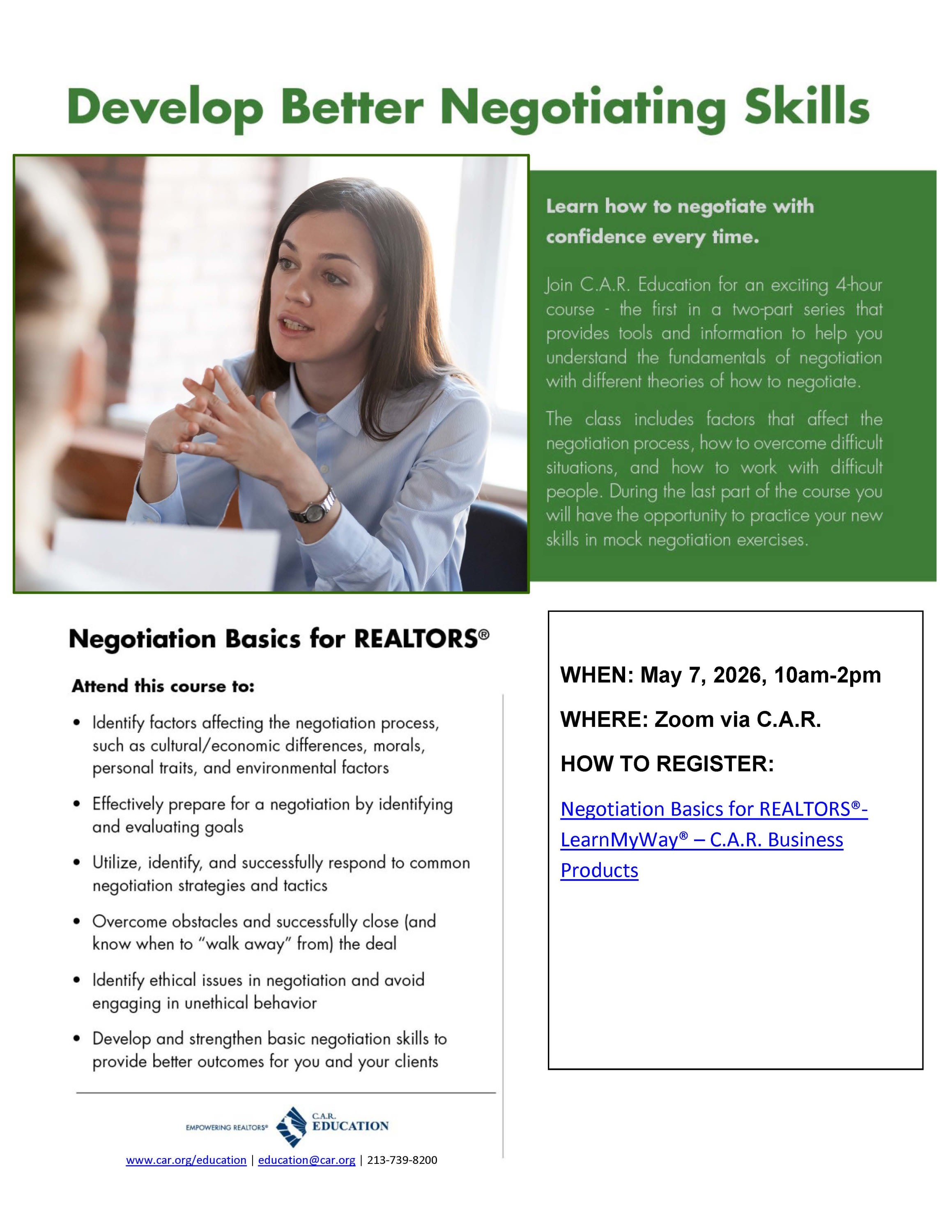 An exciting course that provides tools and information to help you understand the fundamentals of negotiation with different theories of how to negotiate. The class includes factors that affect the negotiation process, how to overcome difficult situations, and how to work with difficult people. Learn how REALTORS® negotiate daily from deciding who will pay for the pest inspection to selecting the time for an open house and agreeing on compensation.