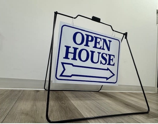 METAL A - FRAME OPEN HOUSE STANDS BLUE AND WHITE SIGN - BLACK FRAME <SKU: 135>